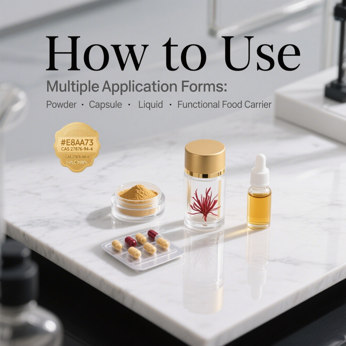 Crocetin is commonly used in the formulation of dietary supplements, functional foods, and even cosmetics due to its various health benefits. It is often incorporated into capsules, tablets, or powder form, making it easy to integrate into daily wellness routines.